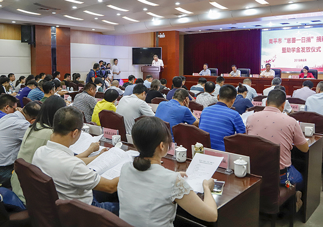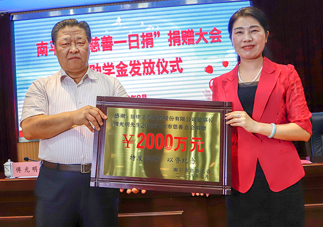 8月16日,南平市“慈善一日捐”捐赠大会暨助学金发放仪式在延平举办,市委常委、统战部长庄莉,市慈善总会会长、福建圣农发展股份有限公司董事长傅光明出席活动。